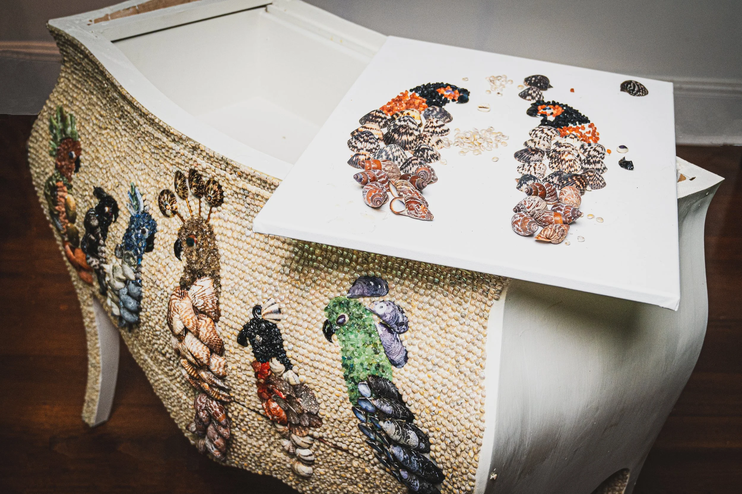 Using wooden chests as her canvas, Tina crafts distinctive seashell and stone designs that bring natural colors, textures, and beauty into the home.